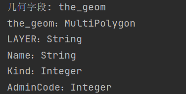 如本例中输出属性结构如下,读取出来的几何字段名称为the_geom,类型为MultiPolygon,其他为属性字段及类型。