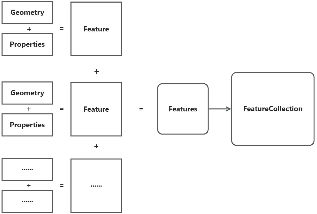 GeoJSON对象表示几何对象(Geometry)、要素对象(Feature)、以及要素类对象(Features)的集合(FeatureCollection),具有如下特征。