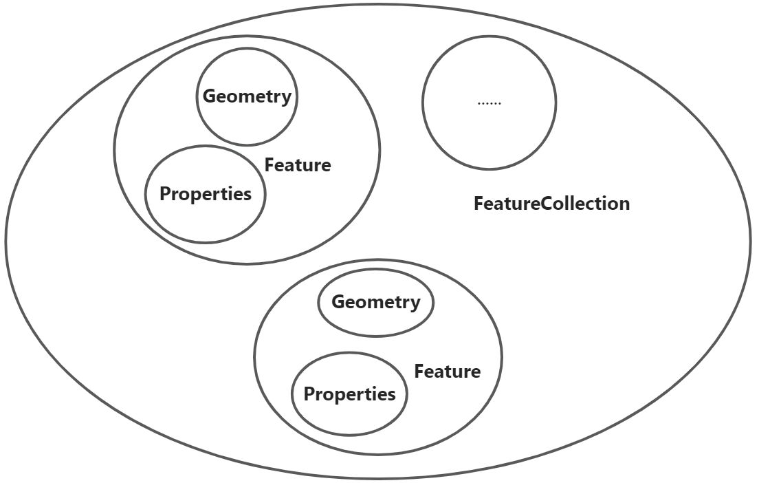 要素FeatureCollection对象type属性为"FeatureCollection",由features数组构成。元素是Feature对象。
