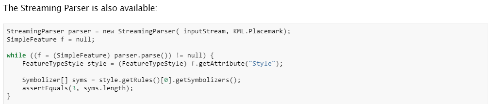 StreamingParser解析器的参数是三个,而不是两个,其中第一个参数为new KMLConfiguration();获取样式特征方法为style.rules().get(0),而不是style.getRules(0)。