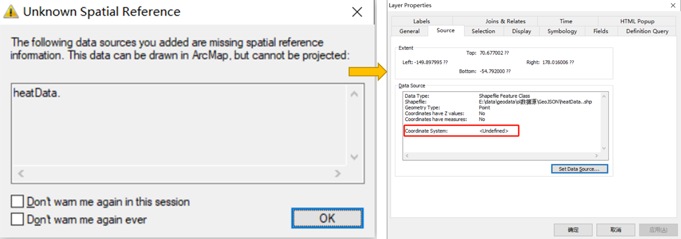 在创建Shp对象时,还是需要指定坐标信息,否则转换结果将缺少坐标系统。在GIS软件中打开数据可以查看元素据信息,下图是未指定坐标系时在ArcMap中的打开情况。