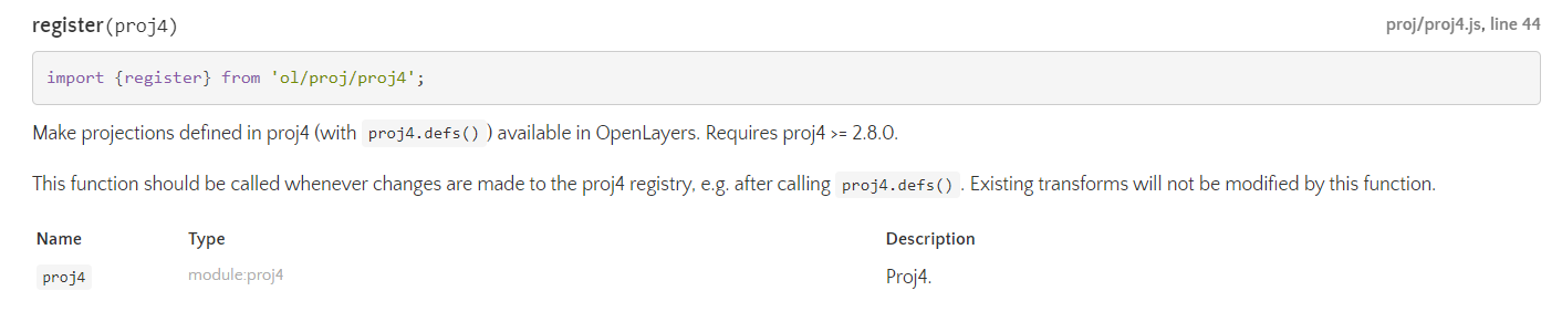 **register**说明大意就是要使proj4中定义的投影(使用proj4.def())在OpenLayers中可用。需要proj4的版本大于等于2.8.0。并且每当对proj4注册表进行更改时,如在调用proj4.def()之后,都应该调用register函数。此函数不会修改现有变换。具体信息见官网:[https://openlayers.org/en/v9.2.4/apidoc/module-ol_proj_proj4.html](https://openlayers.org/en/v9.2.4/apidoc/module-ol_proj_proj4.html)