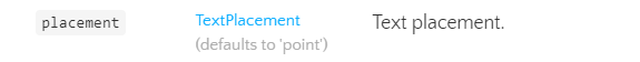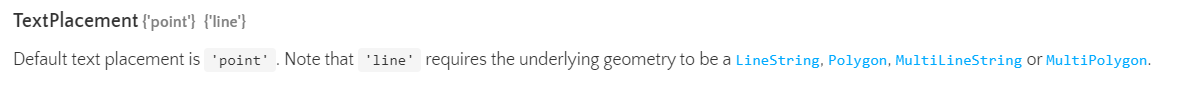 placement类型为TextPlacement,该类型具有两个值"point"和"line"。文字标注默认标注类型为"point",而只有在几何对象类型为LineString、Polygon、MultiLineString或者MultiPolygon时,placement的值才可以设置为"line"。
