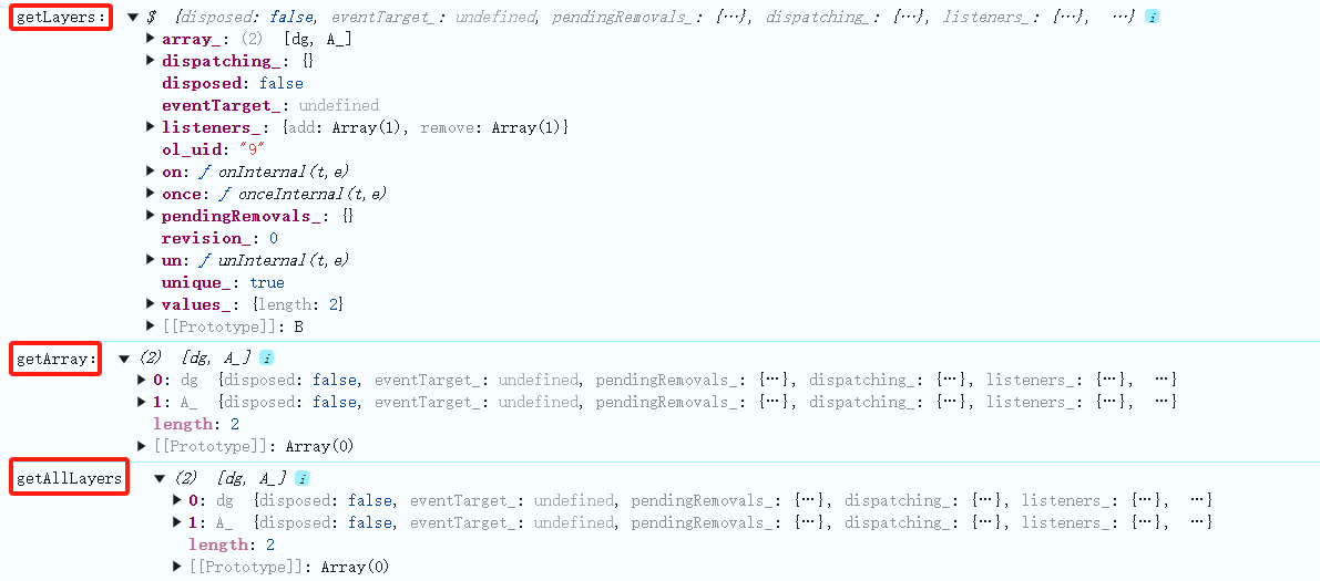 通过使用getArray()方法将其转换为数组后,getLayers和getAllLayers方法返回的图层数据结构一致。