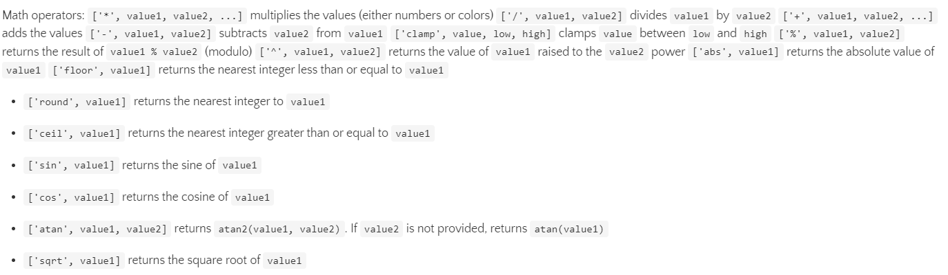 • ['*', value1, value2, ...]:将多个数字或者颜色值相乘并返回运算结果。