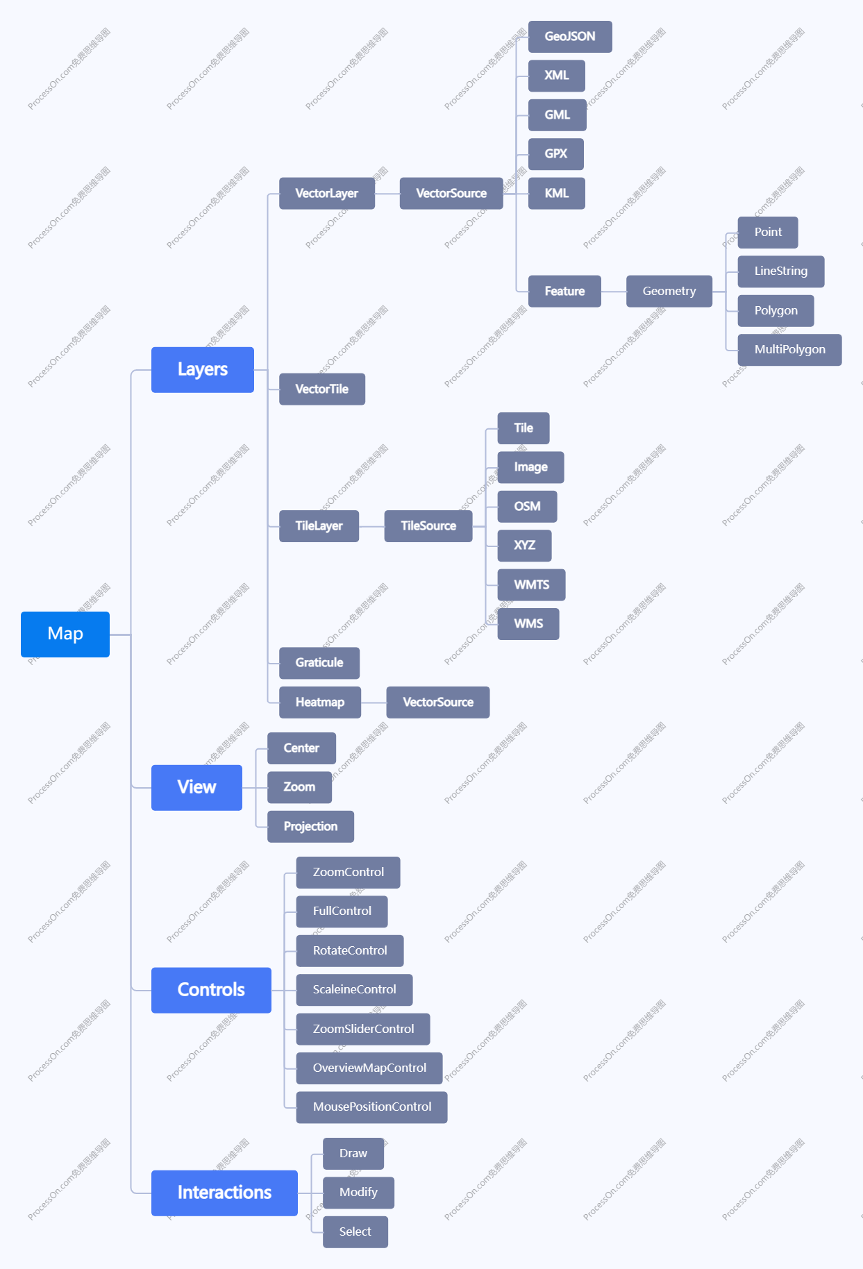 首先从Map对象入手,Map作为核心类,包括View、Layers、Control、Interactions等类。Map就像是一个容器,用来装载、渲染图层;View用来对图层进行可视化,设置地图状态,包括缩放、中心点和投影系统等;Control类提供了一些系统控件公开发者使用,包括缩放、全屏、鹰眼等控件;Interactions提供了绘制、选择、编辑等交互操作,方便用户使用。
