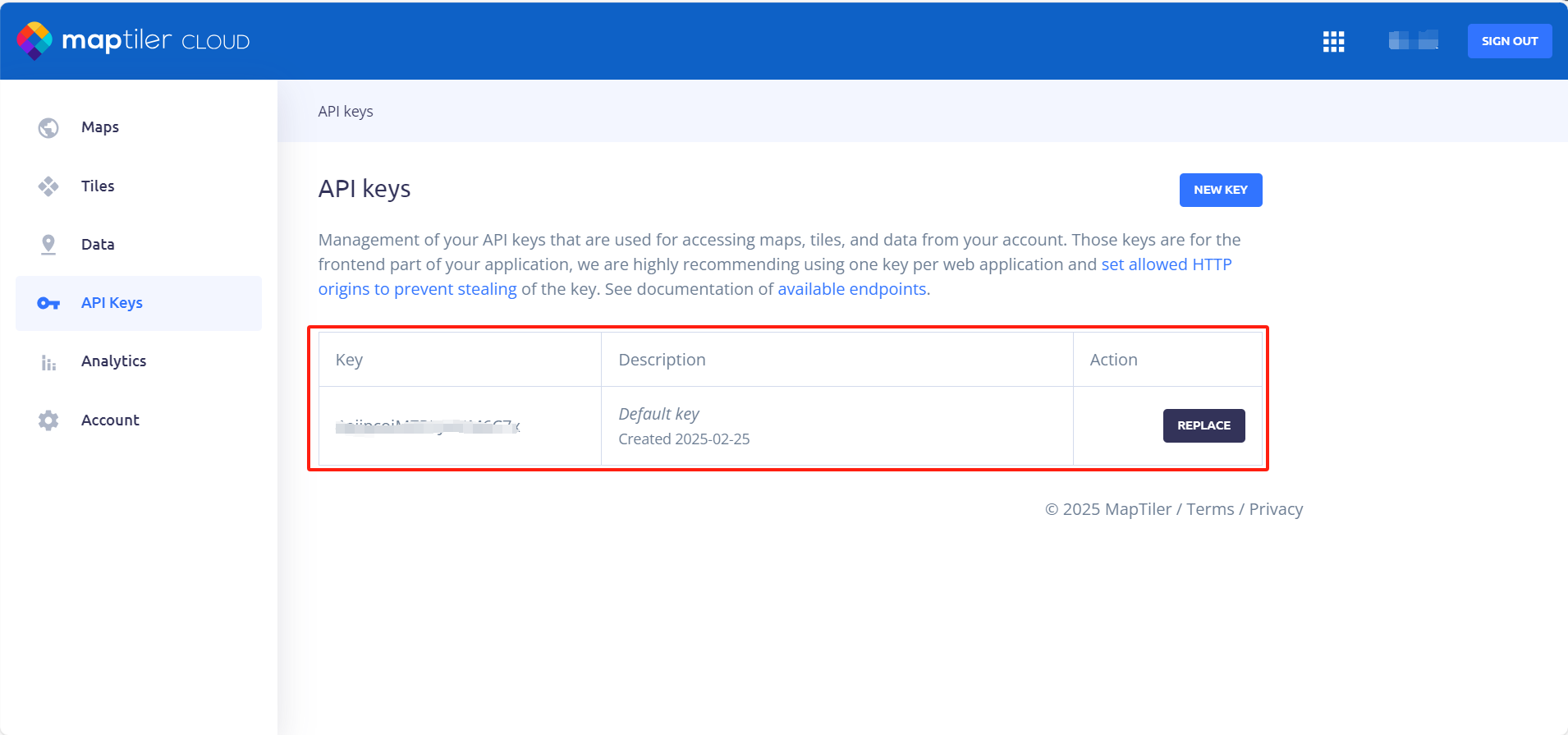 例子使用maptiler地图切片服务和地形服务数据进行展示,在进行地图开发前,如果还没有地图开发的key值,需要到maptiler官网申请key。