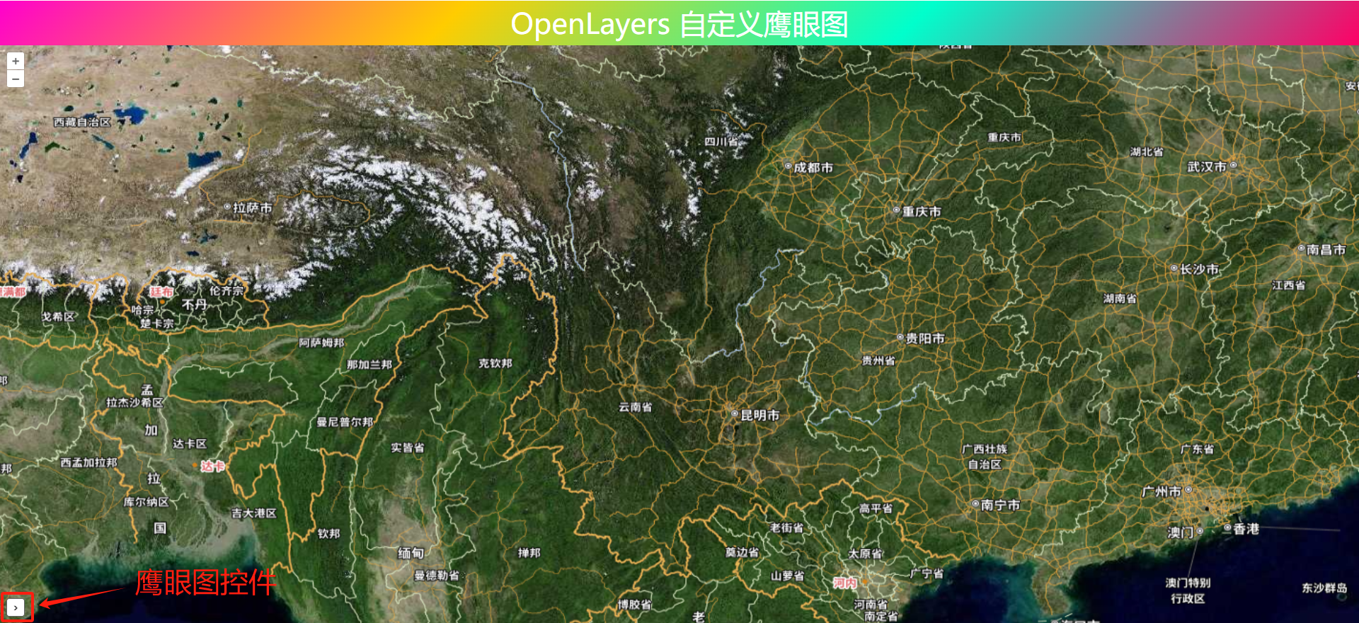 鹰眼图可以叫做鸟瞰图或者缩略图。在鹰眼中,可以显示当前地图范围,可以移动或者拖动到目标位置。鹰眼显示范围大,内容相对粗略。OpenLayers鹰眼控件默认显示在地图左下角,可以通过修改CSS样式进行调整。