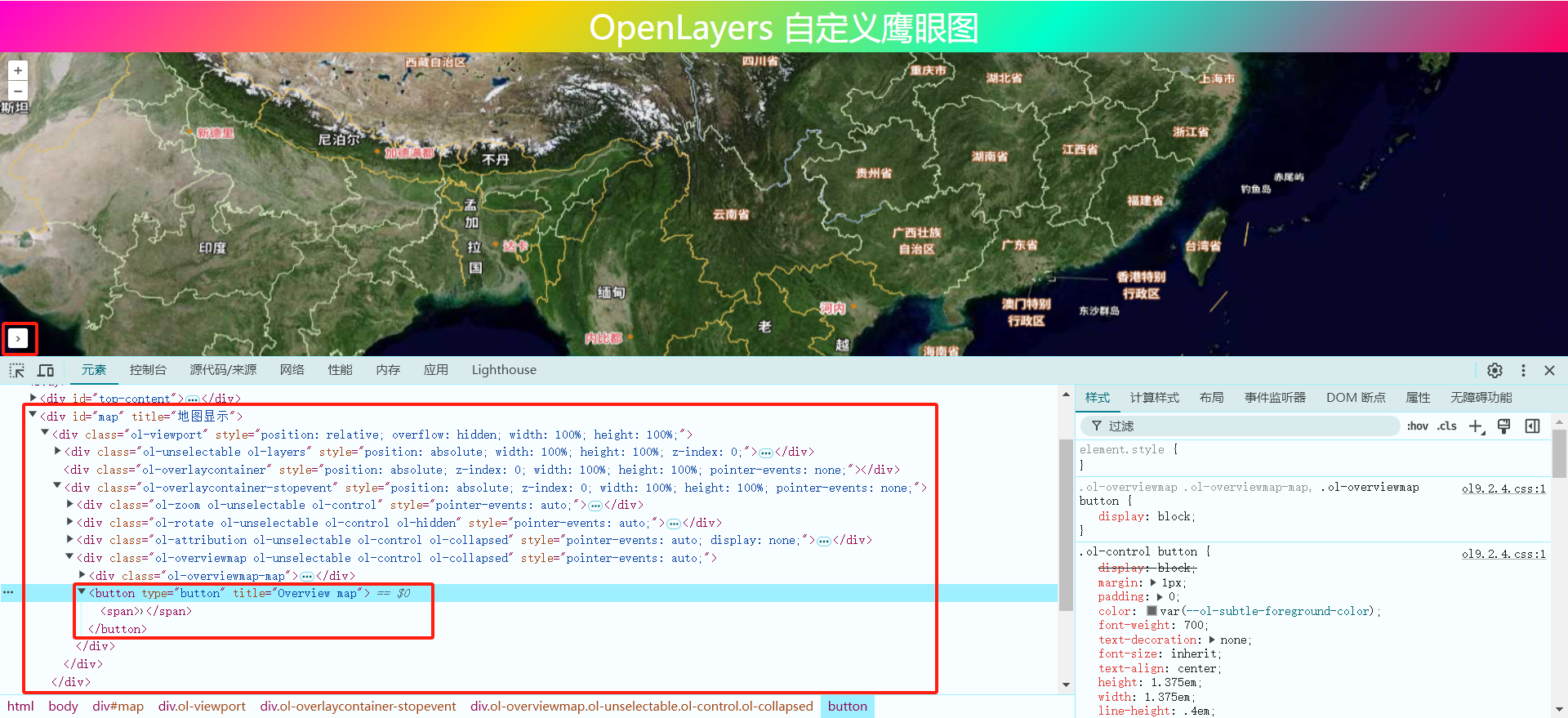 设置className值为ol-overviewmap ol-custome-overviewmap,其中ol-overviewmap为鹰眼控件默认类名。添加CSS样式设置鹰眼图显示位置以及展开样式,修改控件选择盒子边框颜色并调整收缩按钮位置。此时鹰眼控件位于地图视图内