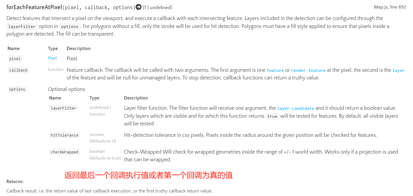 forEachFeatureAtPixel | Map | {pixel,callback,options} | 最后一个回调执行值或者第一个为真的回调值 |