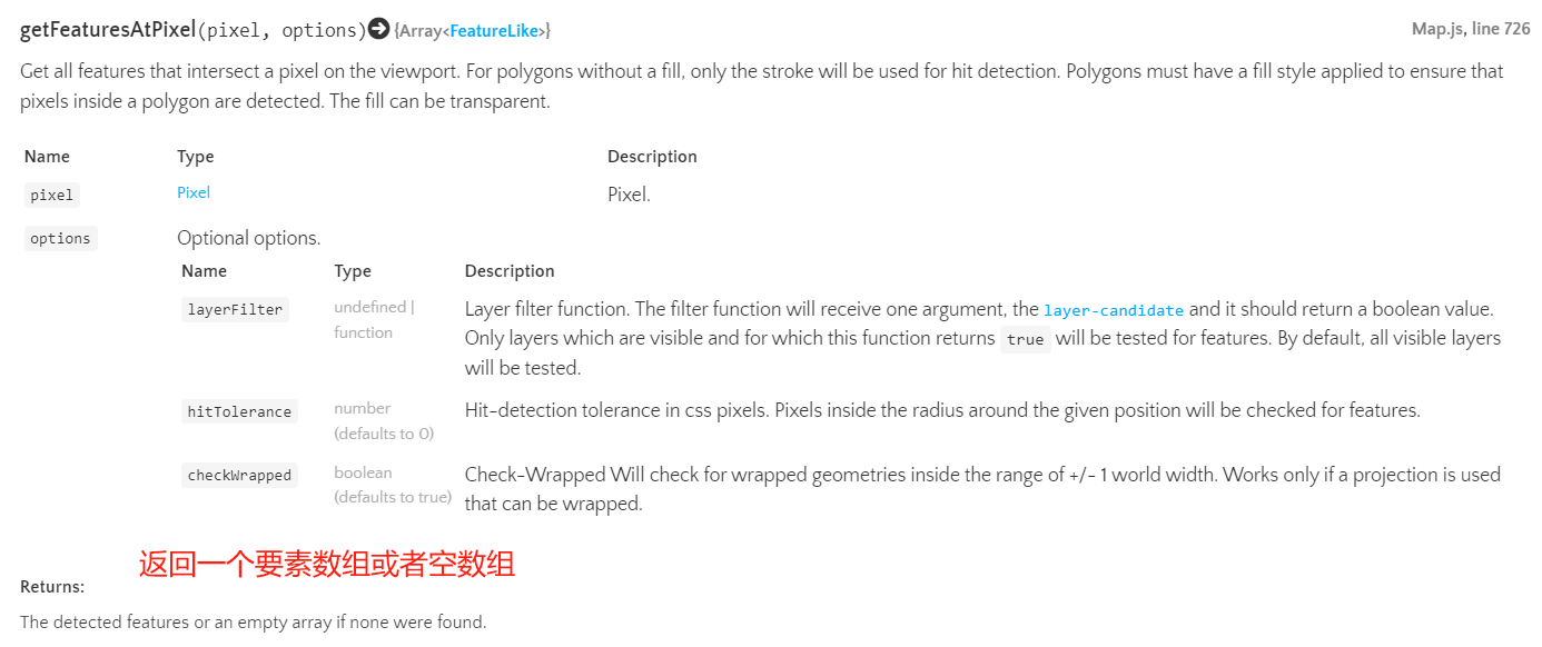 getFeaturesAtPixel | Map | {pixel,options} | 一个要素数组或者空数组 |