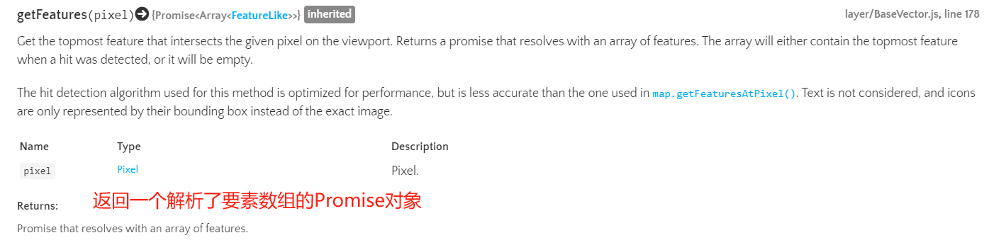 getFeatures | VectorLayer | {pixel} | 一个解析了要素数组的Promise对象 |